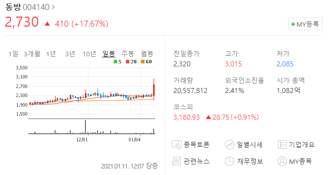 이미 쿠팡 나스닥 예비심사 통과 속보가 뜬 이후에 상한가를 칠....뻔 했다가 다시 내려왔지만 쿠팡 관련 대장주의 힘을 유감없이 보여주고 있습니다. 쿠팡 주식을 검색하면 가장 먼저 뜨는게 동방입니다.