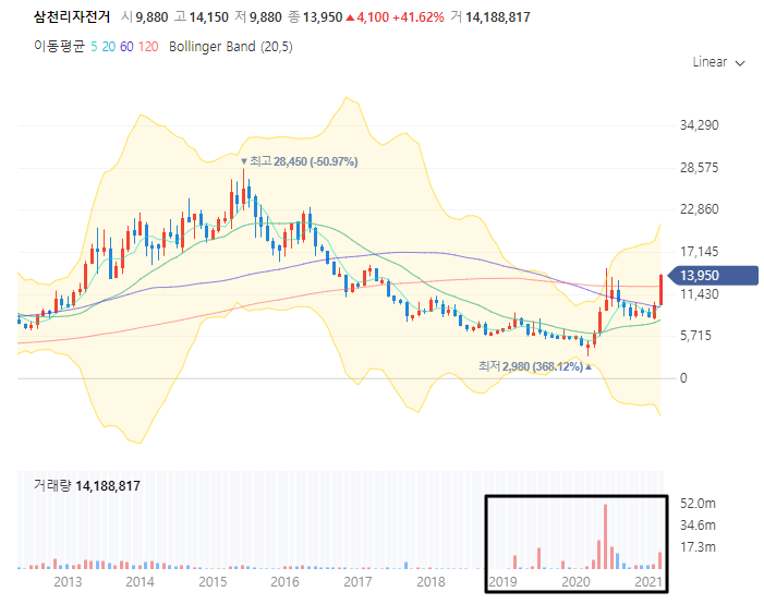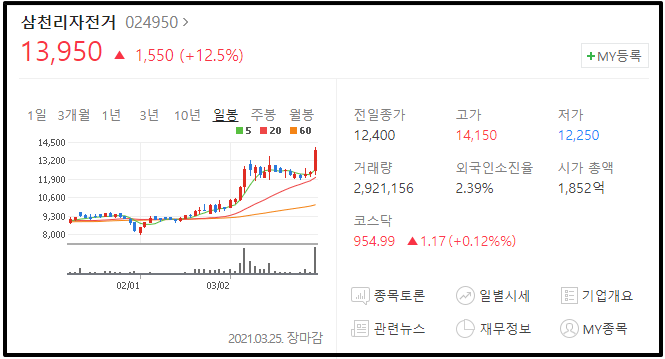 삼천리자전거가 2021/03/25일 상당히 화끈한 장대양봉을 뽑아주었습니다. 제가 얘기해본 주린이 분들은 삼천리자전거가 상장 되어있는지도 잘 모르시더라구요. 물론 주목을 받게 된건 아무래도 최근부터이다 보니까..